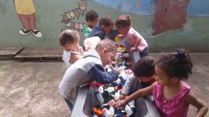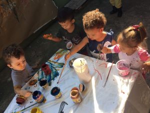 Giz no chão, bolas, jogos, brincadeiras de roda, madeiras para construções, brincadeiras com tecidos, brincadeiras com pneus, água, Pintura com guache e com materiais diversificados.