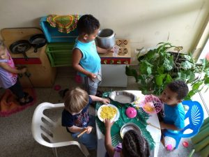Momento de brincadeira livre de acordo com a vontade das crianças. Livre escolha de materiais, de pares e da brincadeira ou jogo que a criança desejar. Quebra-cabeças, blocos lógicos, madeiras, pneus, tecidos, casinha de bonecas, canto da leitura, brincadeiras de comidinha com panelinhas e vasilhas, brinquedos diversos, jogos, são algumas das alternativas de atividade disponível.