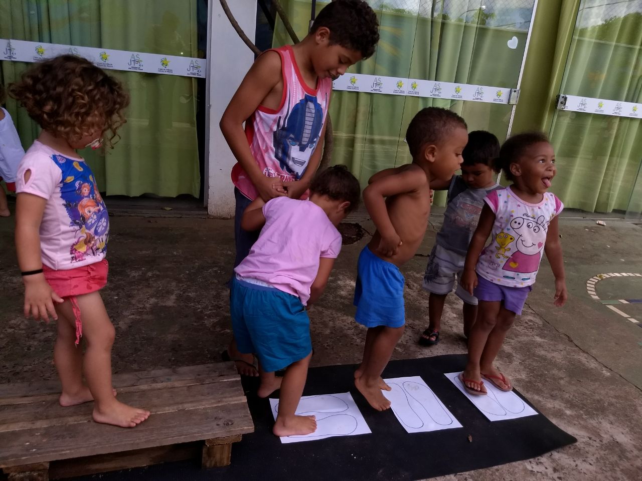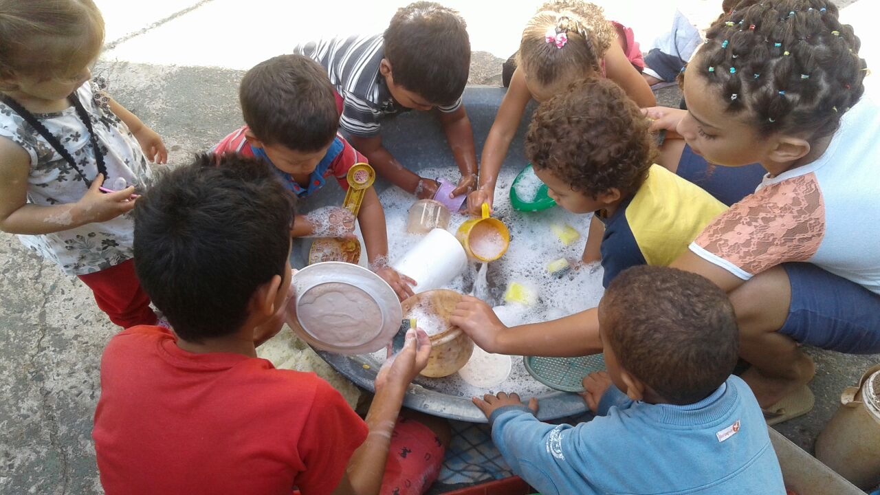 Giz no chão, bolas, jogos, brincadeiras de roda, madeiras para construções, brincadeiras com tecidos, brincadeiras com pneus, água, Pintura com guache e com materiais diversificados.