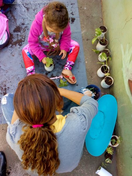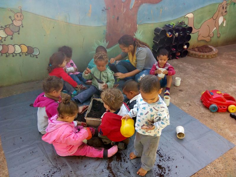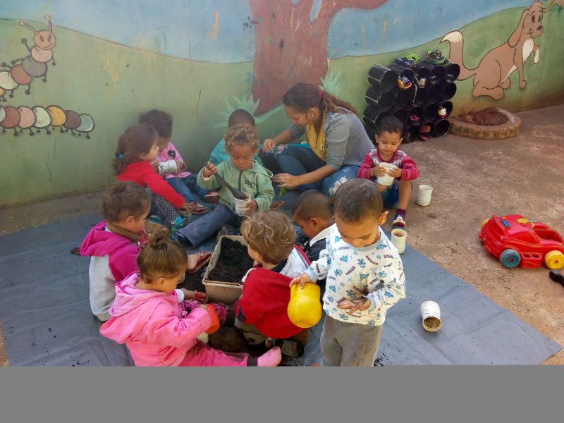 O dia com as crianças na Casa da Infância Estrela da Manhã iniciou com muita alegria e aprendizado. Neste dia a atividade foi plantar algumas mudas com as crianças, para decorar uma parede do nosso parque.