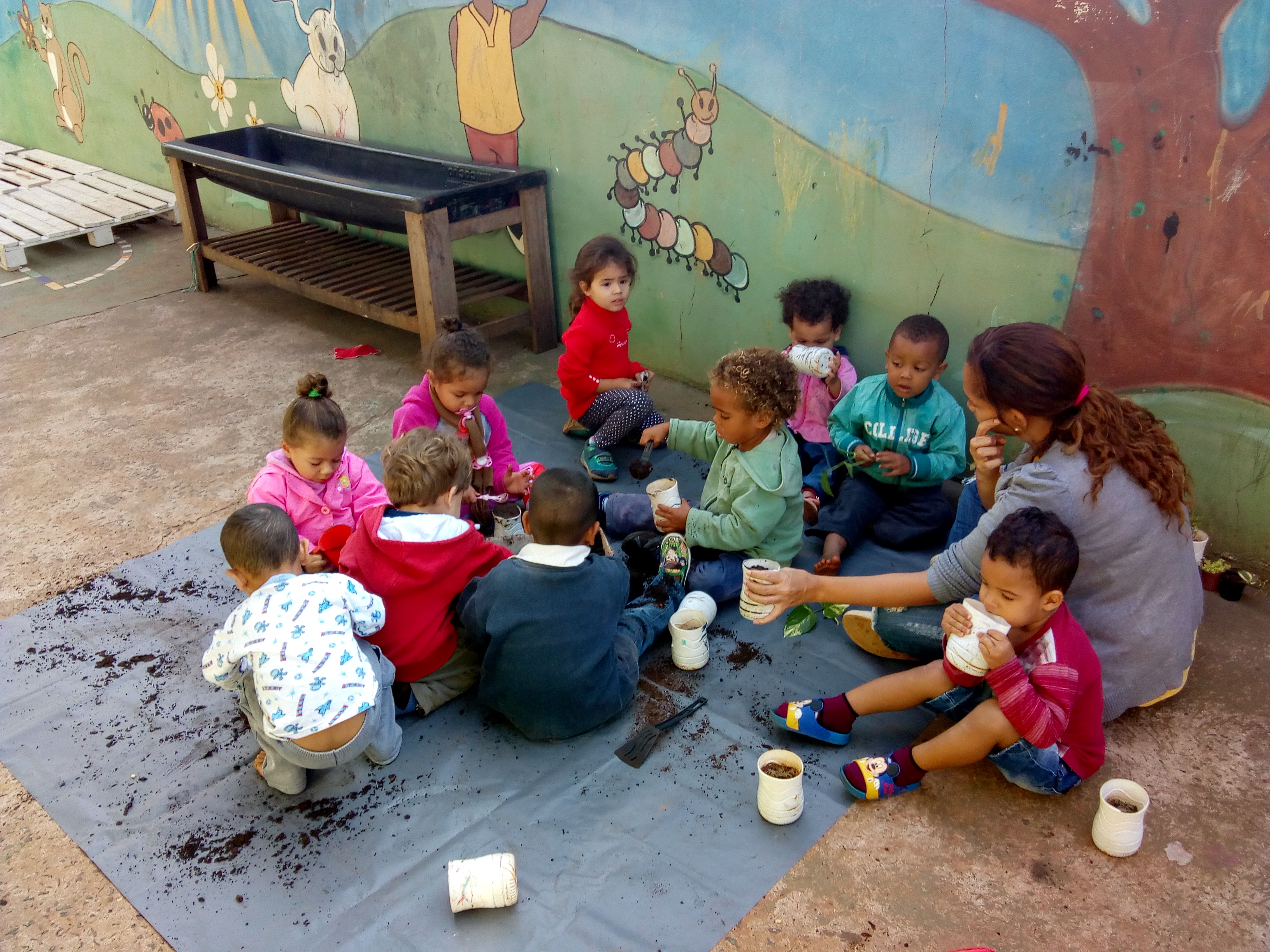 O dia com as crianças na Casa da Infância Estrela da Manhã iniciou com muita alegria e aprendizado. Neste dia a atividade foi plantar algumas mudas com as crianças, para decorar uma parede do nosso parque.