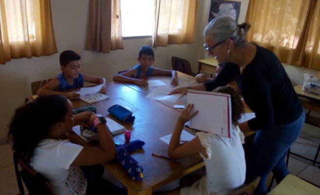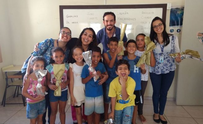 Pelo trabalho da voluntária Marta, as crianças da comunidade aprendem um pouco sobre o idioma espanhol, desenvolvendo a habilidade de comunicação.